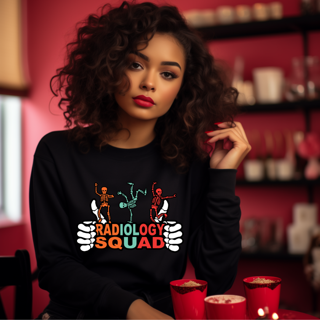 Add a dash of fun to your shifts with our Dancing Skeleton Radiology Squad Sweatshirt, featuring colorful skeletons grooving above the bold “Radiology Squad”.
